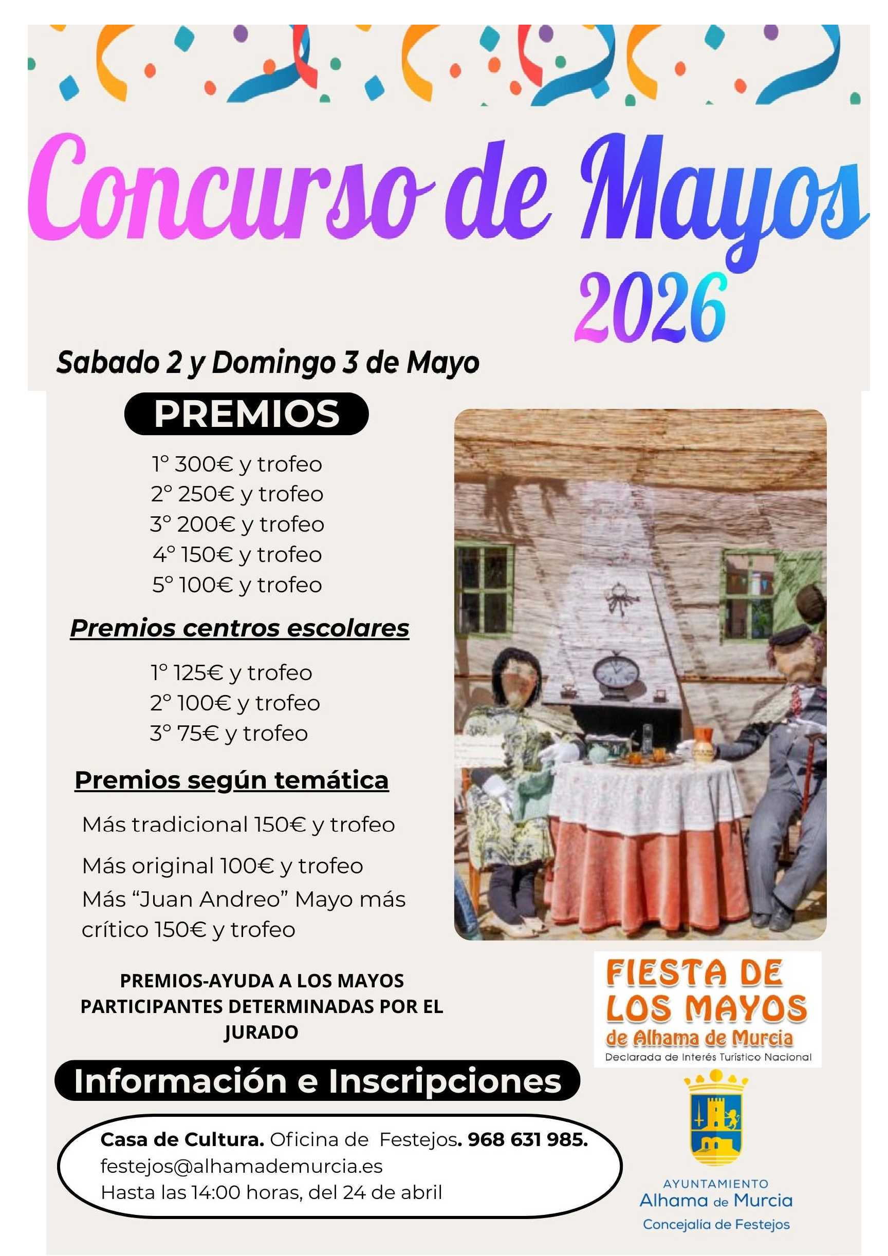 De 10:00 a 18:00 h. Servicio de información y atención al público (mapas de ubicación de mayos y cruces, carteles y programas) y continuación del reparto del pin (hasta agotar existencias) de la fiesta de Los Mayos 2026. Lugar: puerta de la oficina de turismo.